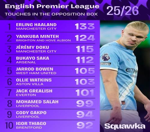 本赛季英超对方禁区触球榜: